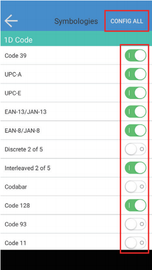 Auf dieser Seite können Sie einige personalisierte Einstellungen für den Scanner vornehmen, Sie können bestimmte Symbologien ein- oder ausschalten und Sie können das Format bestimmter Symbologien festlegen.
