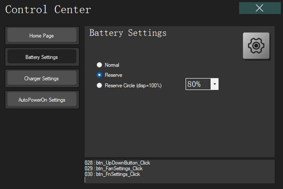 In diesem Abschnitt können Sie das Ladeverhalten des Gerätes anpassen. Der Abschnitt besteht aus drei Unterabschnitten, die über die Buttons links aufgerufen werden können (Battery Settings, Charger Settings, Auto Power On Settings). Über den Button "Home Page" gelangen Sie zur Startseite zurück.