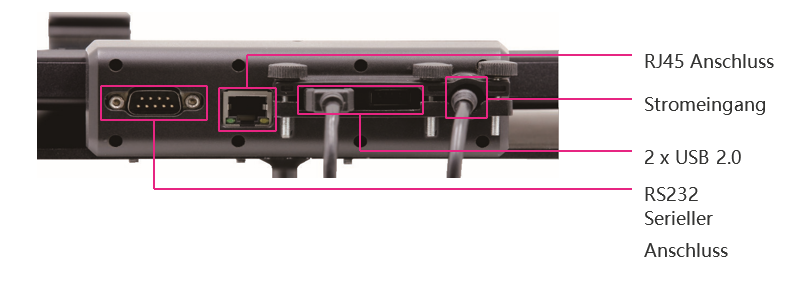 Das Anschlussinterface bietet neben dem Stromanschluss vier weitere Anschlussmöglichkeiten: 2 x USB 2.0, 1 x RJ45 und 1 x RS232. Diese funktionieren nur, wenn die Halterung mit ausreichend Strom versorgt wird.