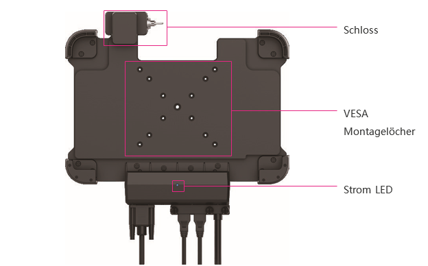 Die Strom LED leuchtet auf, sobald die Dockingstation mit ausreichend Strom versorgt wird um das Tablet zu laden.
