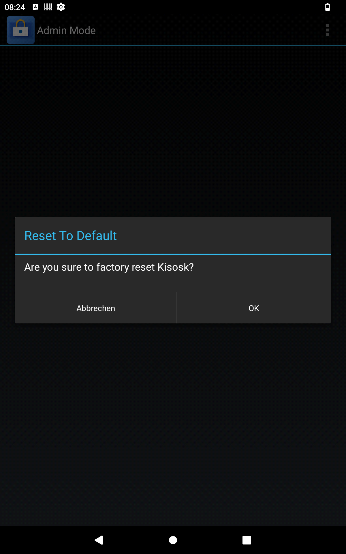 If you press or click on "Reset To Default", a window opens asking you whether you are sure that you want to reset all kiosk mode settings. If you do, confirm by pressing or clicking on "OK". If not, press or click on "Cancel".