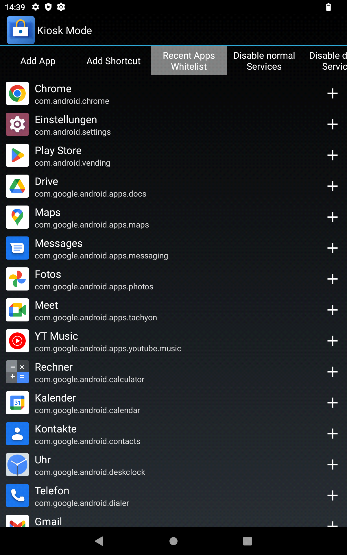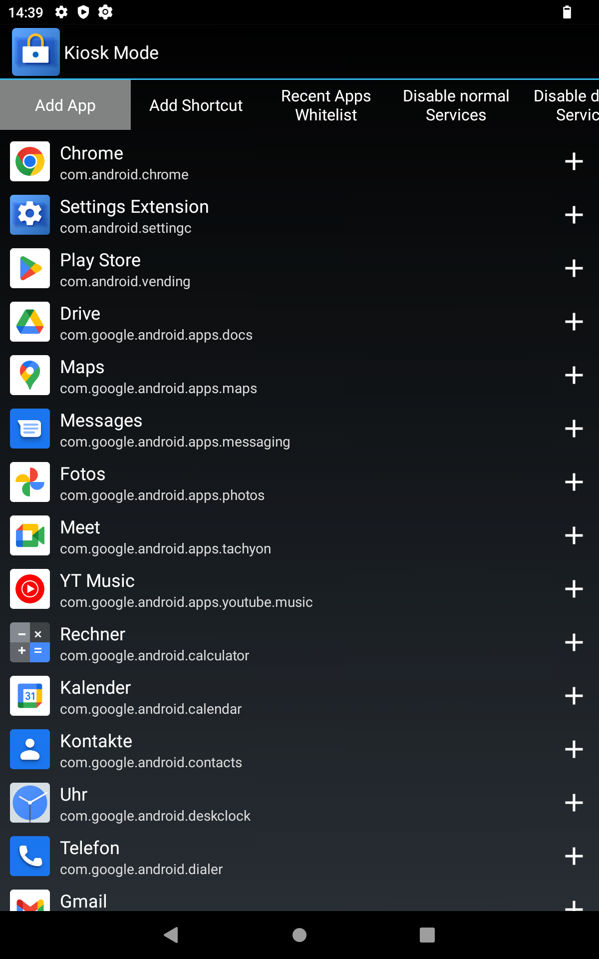 Here you can block the services of applications on the device so that they are also deactivated outside of Kiosk mode. To do this, press or click on the tick symbol on the right in the column. To reactivate them switch to the “Disable Danger Services” sub menu. There you can reactivate them by pressing or clicking on the 🛇 symbol.