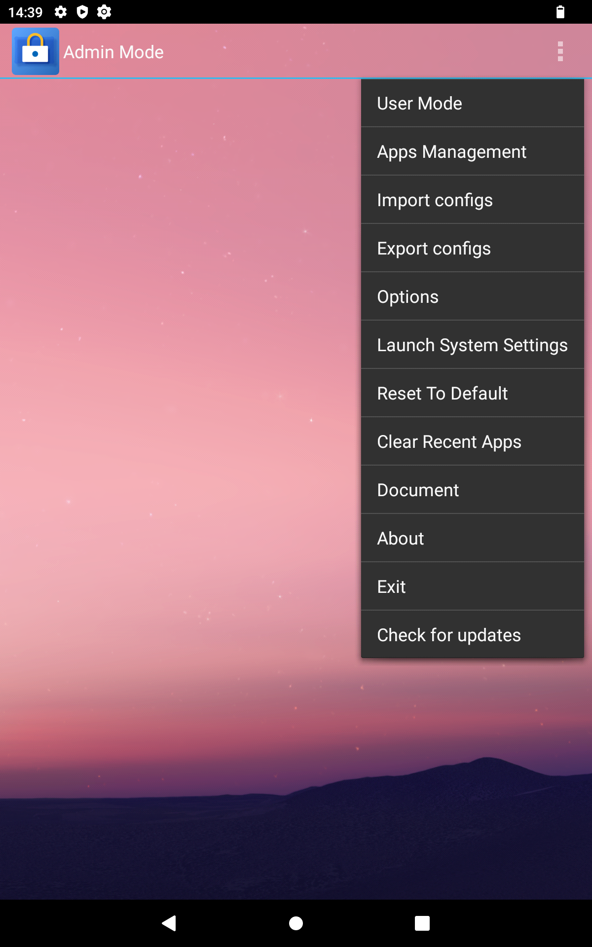 The Admin Mode gives you different options for the configuration of the Kiosk Mode App. By pressing or clicking on the three grey dots in the top right corner of your screen, you access a dropdown menu containing the following sub menus:
