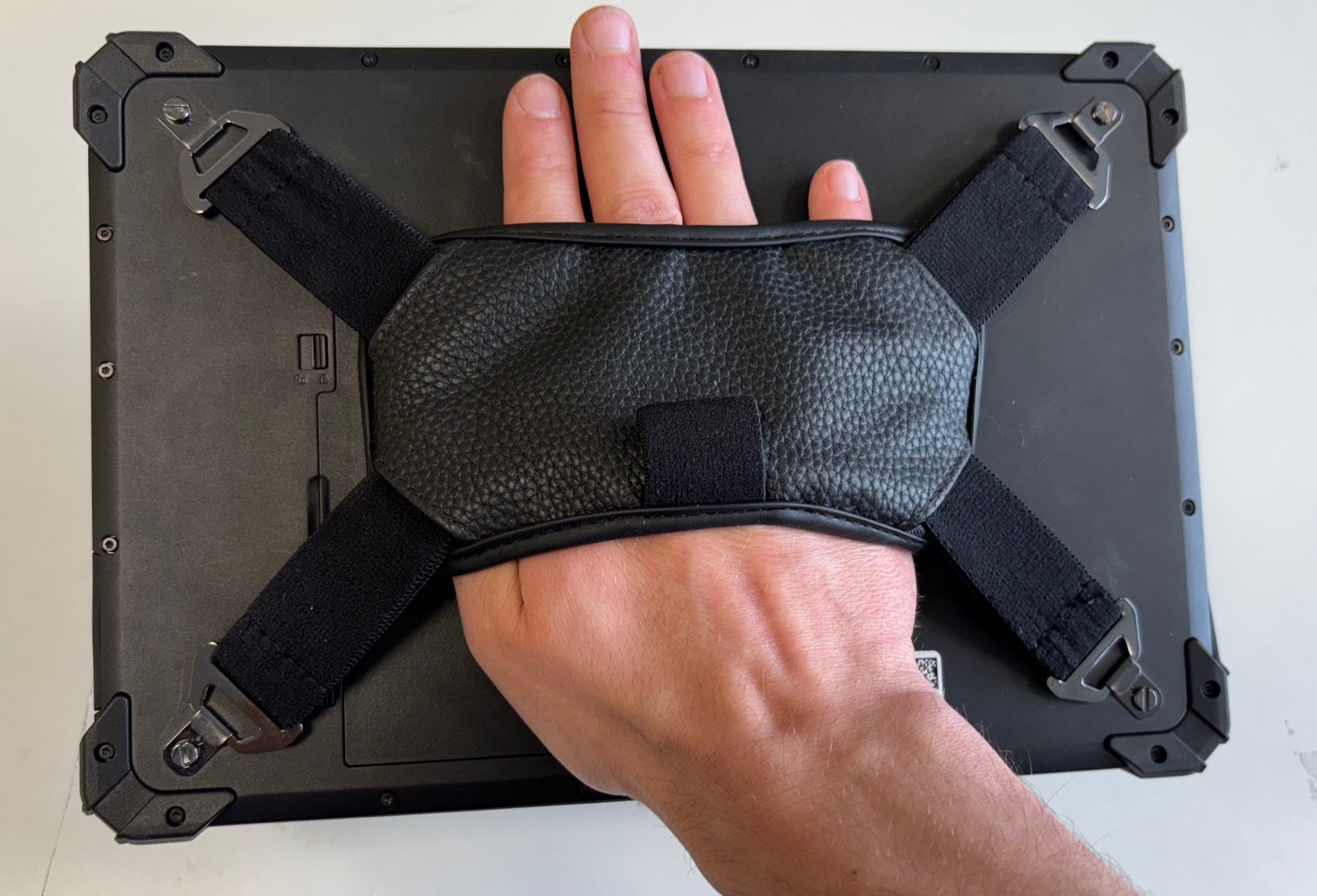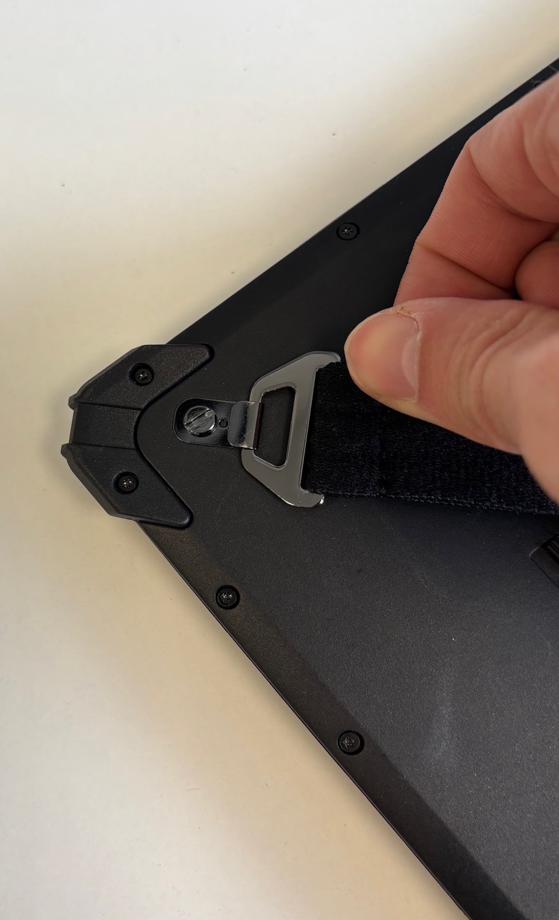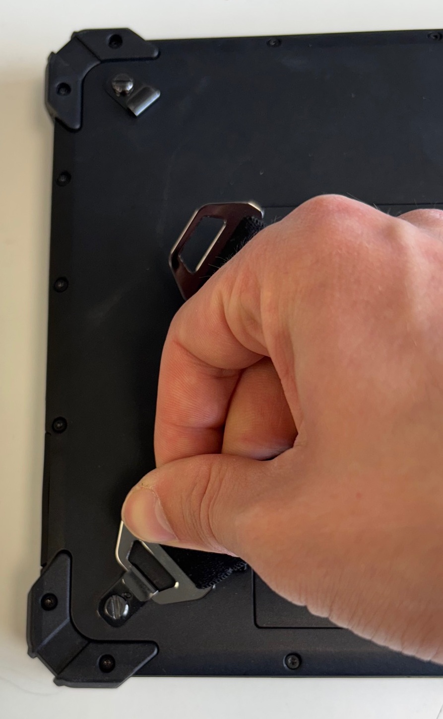 - Haken Sie die gegenüberliegende Seite ein. Ziehen Sie hierfür mit etwas Kraft an der Handschlaufe, diese ist dehnbar. Halten Sie das Tablet dabei gut fest, damit es nicht verrutscht.
