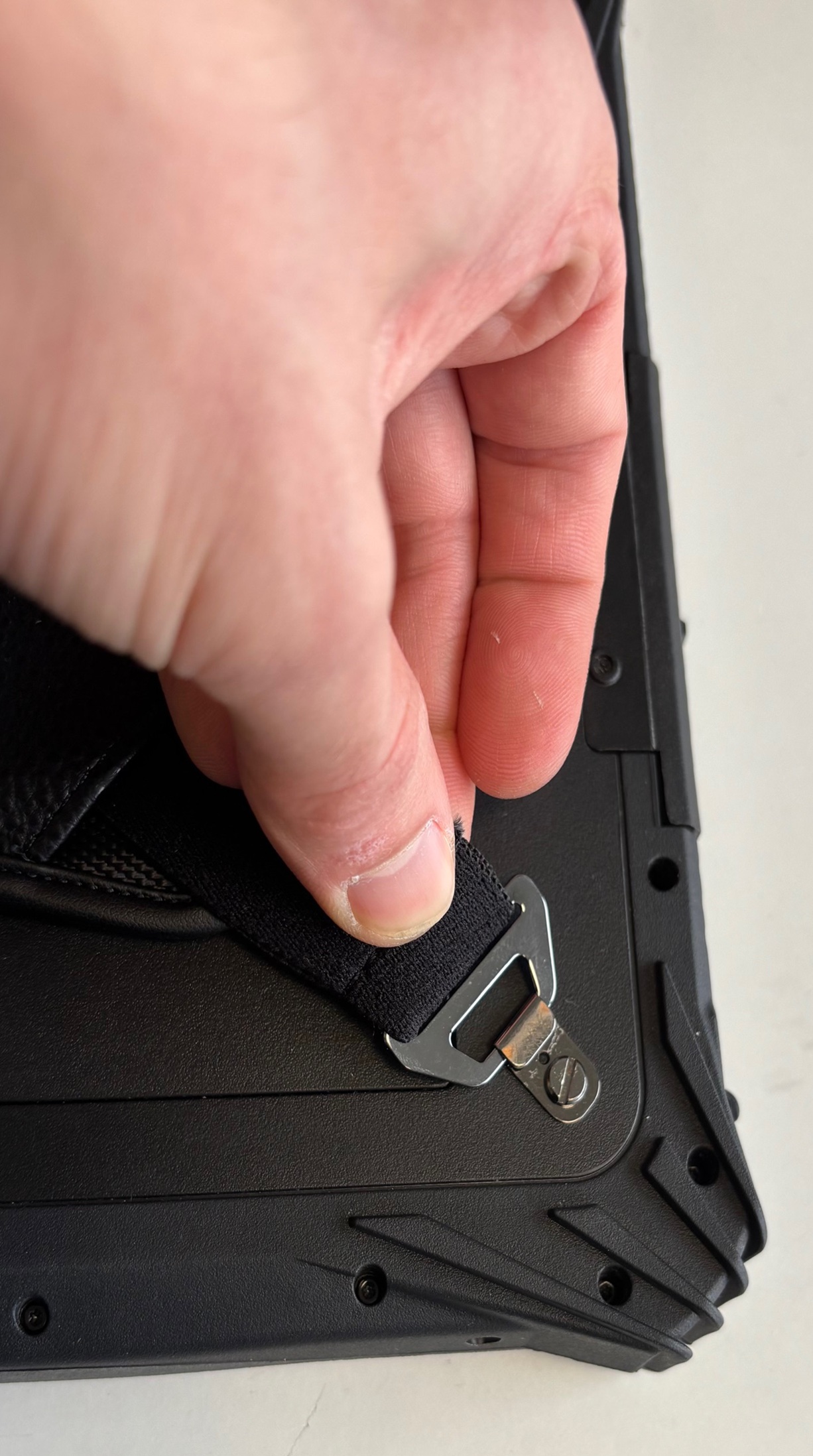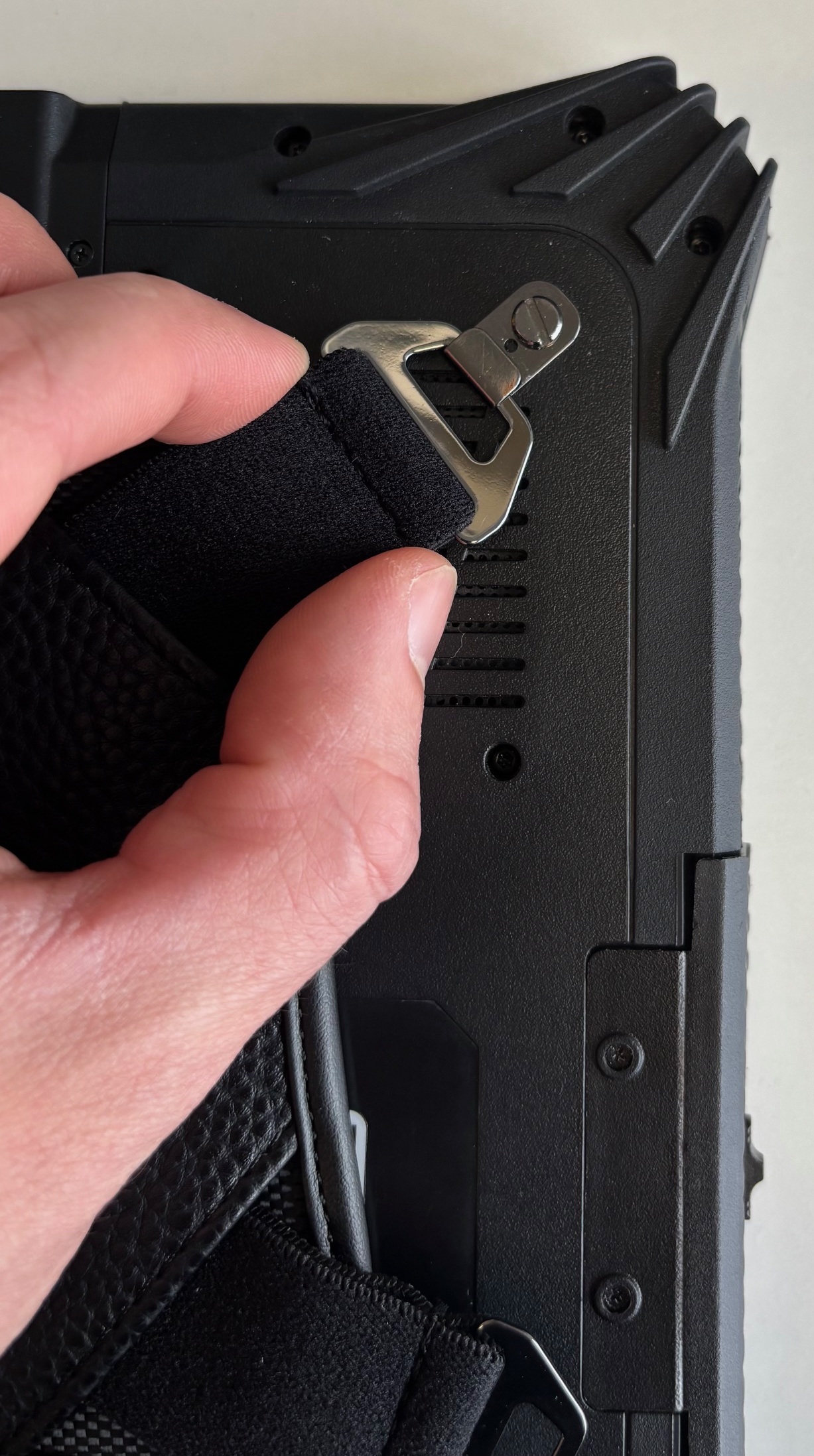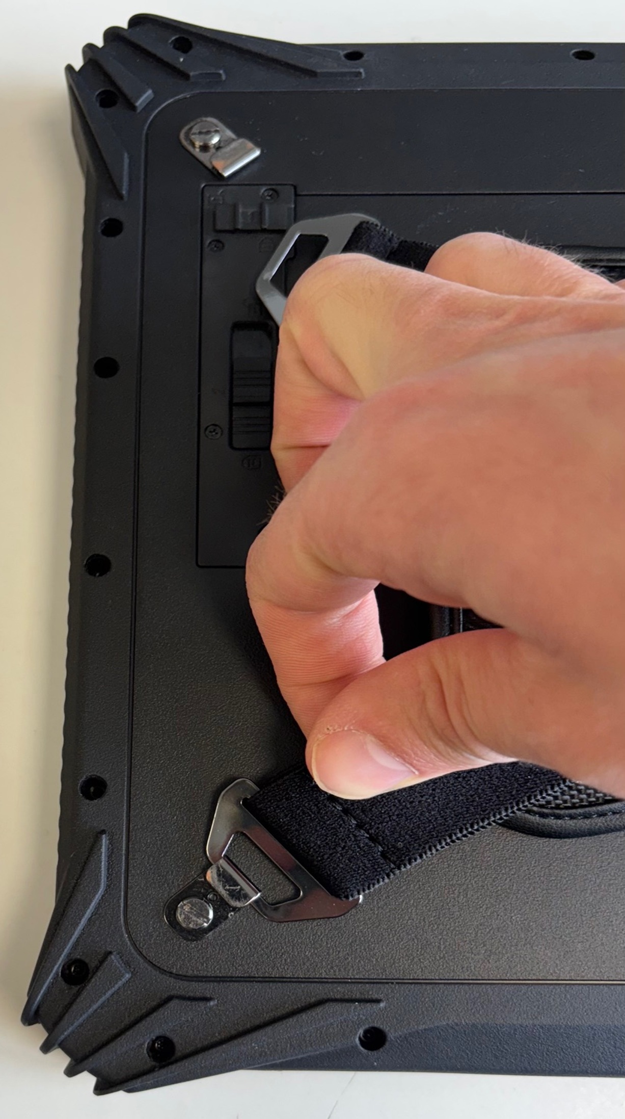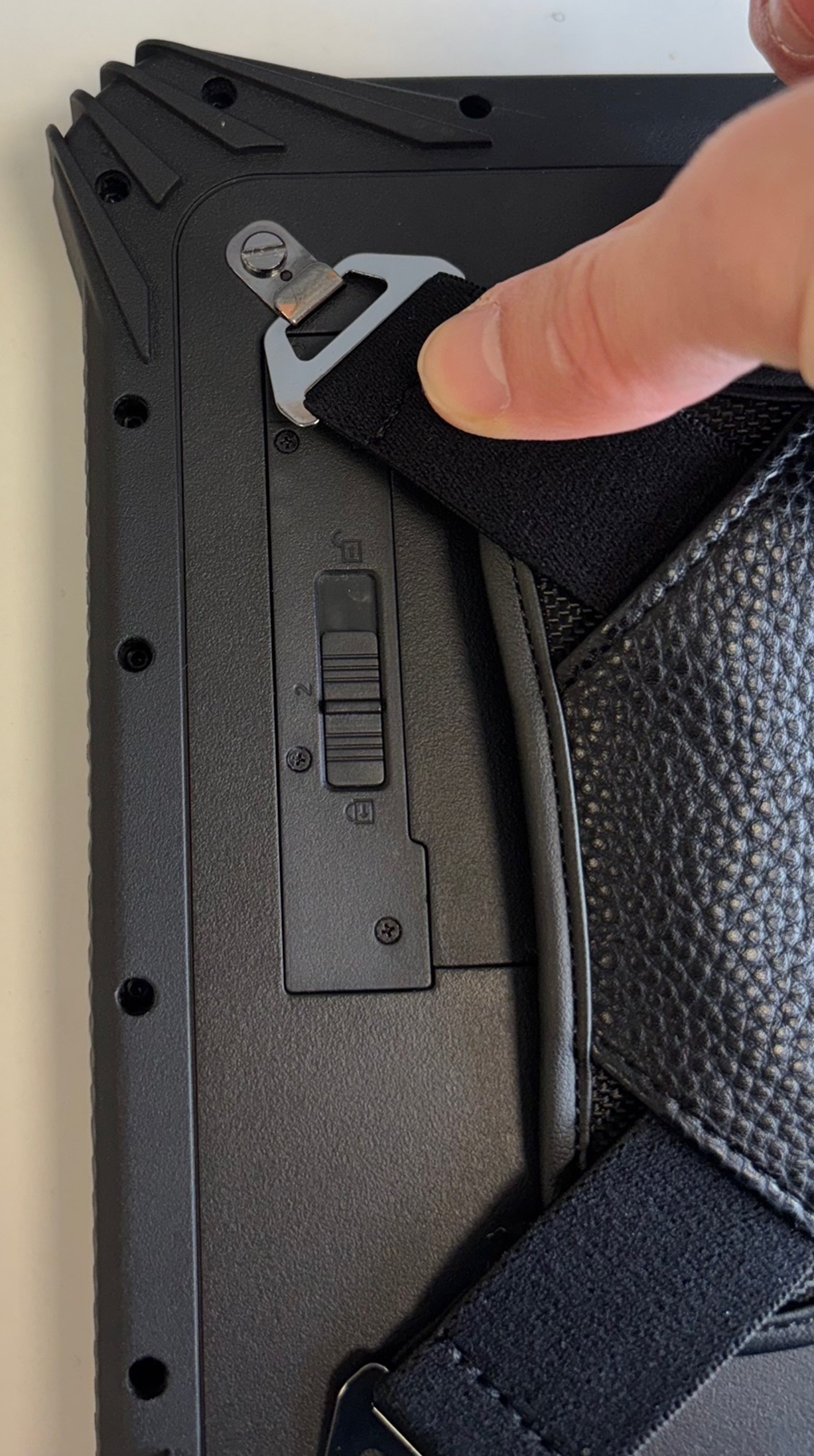 - Haken Sie die gegenüberliegende Seite ein. Ziehen Sie hierfür mit etwas Kraft an der Handschlaufe, diese ist dehnbar. Halten Sie das Tablet dabei gut fest, damit es nicht verrutscht.