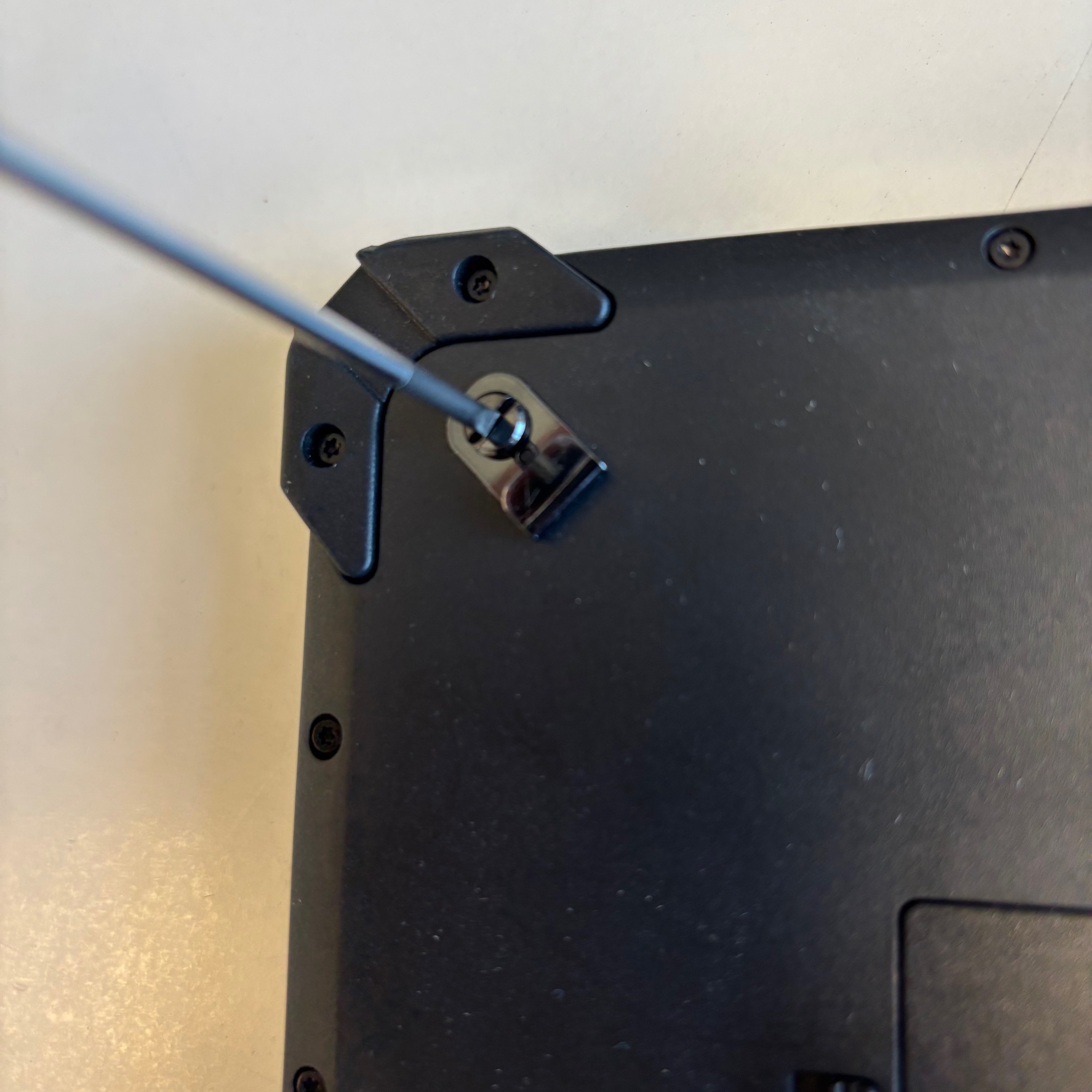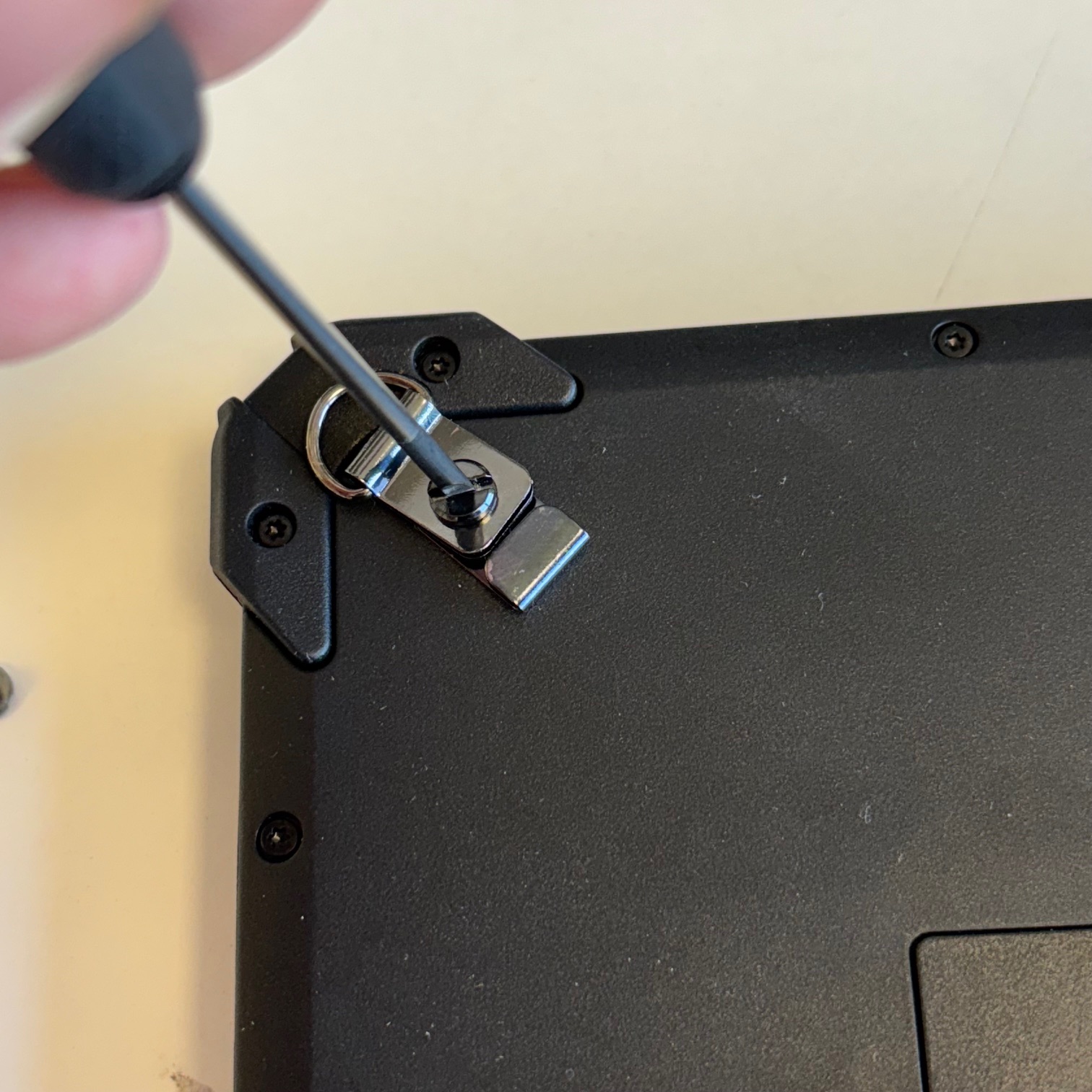 - Entfernen Sie die Schraube an der Handschlaufen-Befestigung mit einem Schlitzschraubendreher.