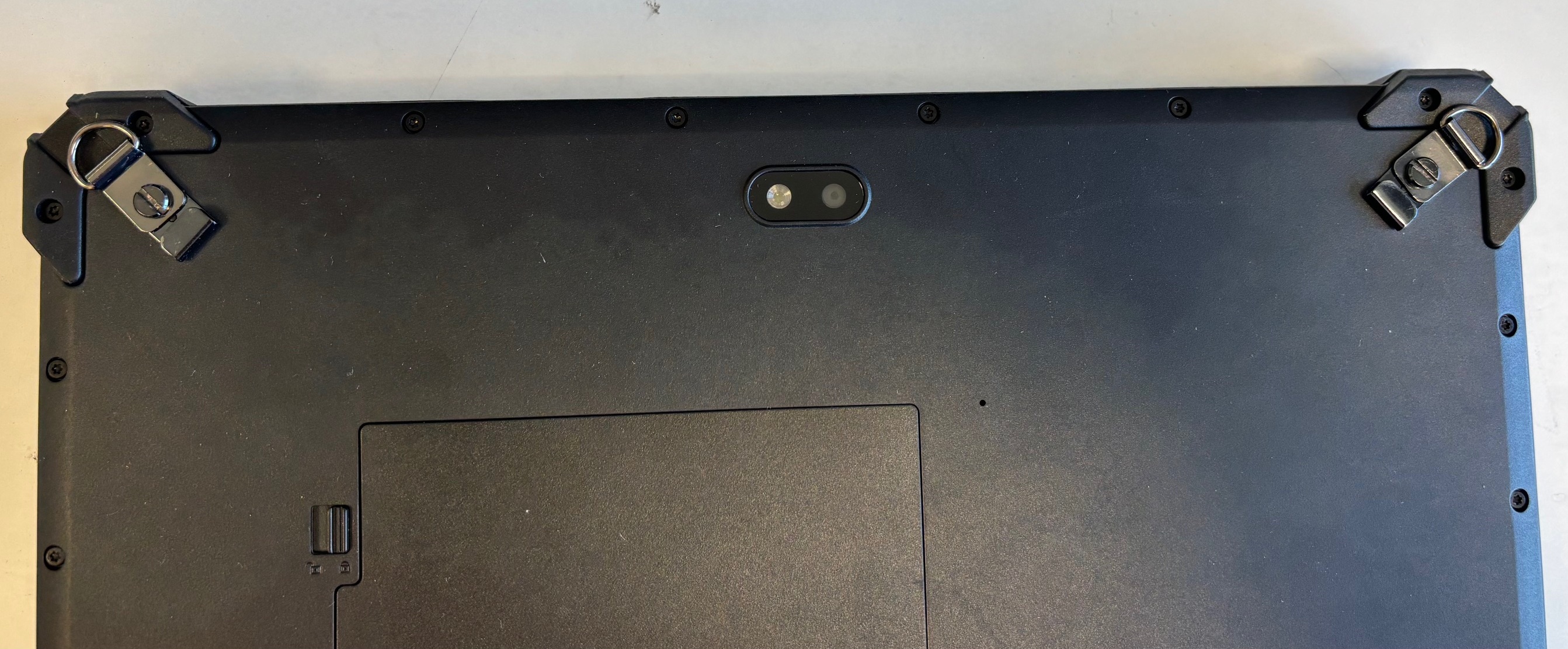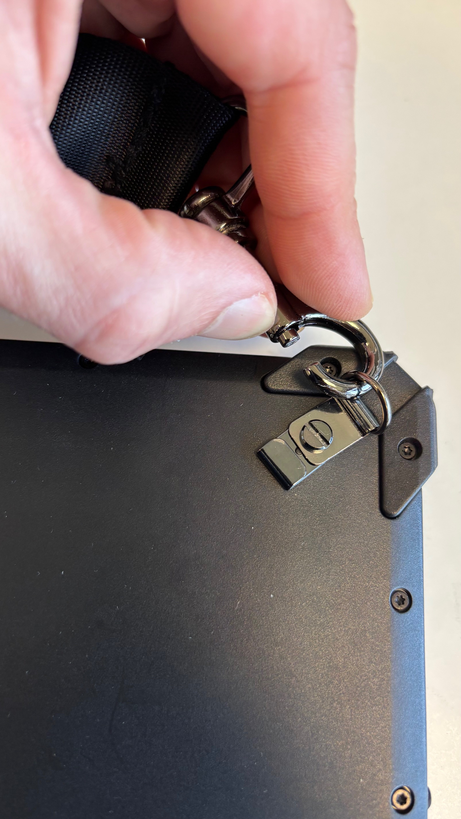 Die Befestigung der Schulterschlaufe erfolgt an den Schrauben für die zwei Haken für die Handschlaufe an der oberen Seite auf der Rückseite des Gerätes.