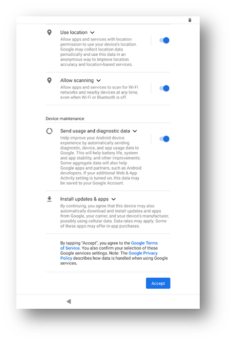 - In the following screen, select the permissions you want to grant to the Google services. Then click on " Accept ".