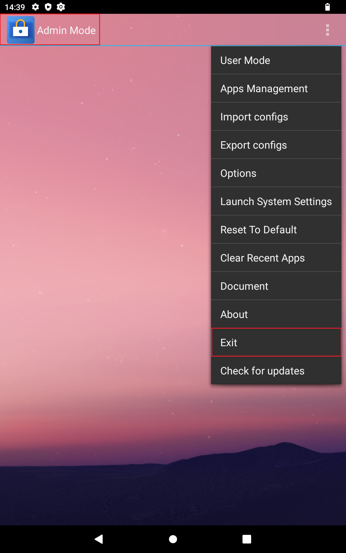 - Being successfully logged in to admin mode (visible at the top left of the screen), you can now change different settings, enable or disable apps and services and exit kiosk mode.