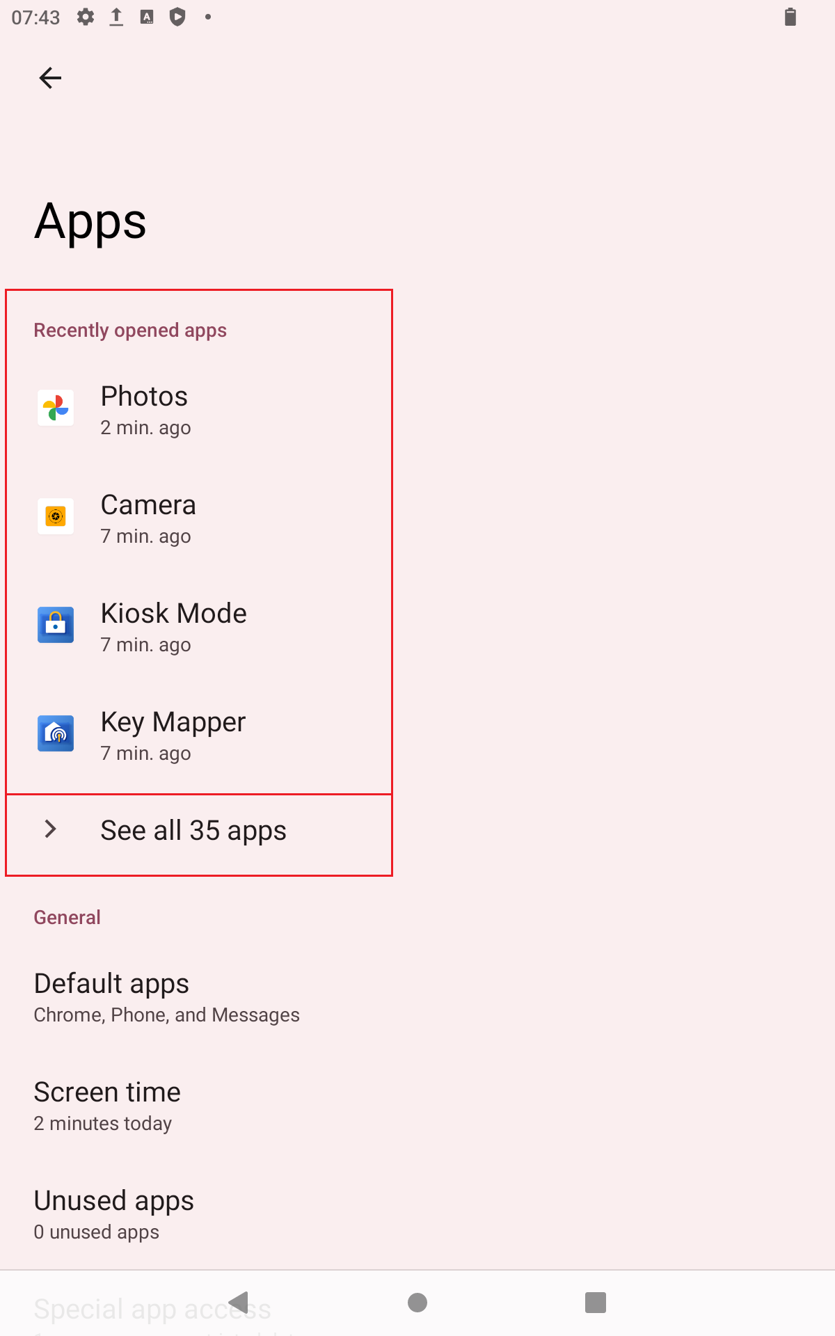 - If the "Kiosk Mode" app is not displayed under "Recently opened apps", press "See all 35 apps" (number may vary). To scroll through the list, swipe your finger upwards from the bottom of the screen until you see the "Kiosk Mode" app.