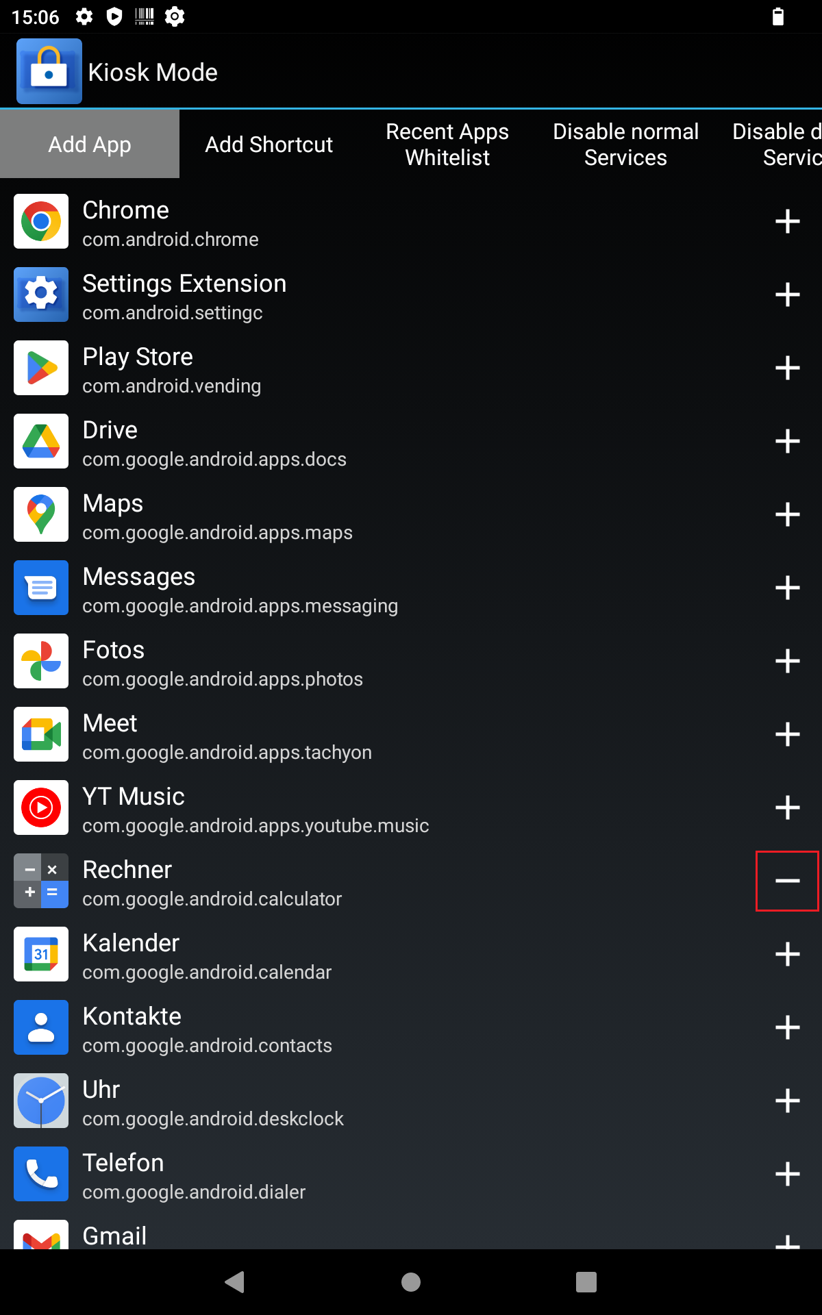 - To add applications from the list to the kiosk user screen, press the plus symbol to the right of the application with your finger. The application now appears on the user screen of the kiosk mode and can be used by the user.