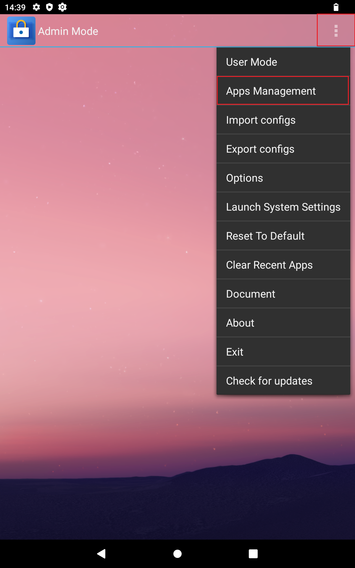 - press "Apps Management" in the menu bar that opens.1 In administrator mode, press the three gray dots at the top right of the screen with your finger.