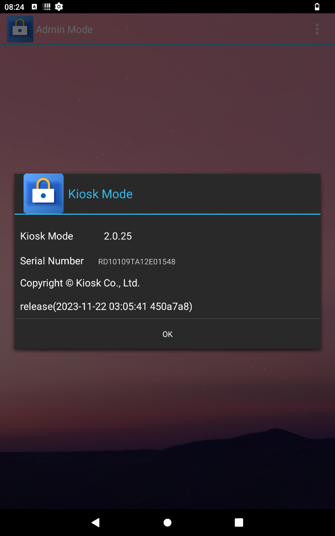 Pressing or clicking on "About" opens a window in which the version information and the serial number of the Kiosk Mode application are displayed.