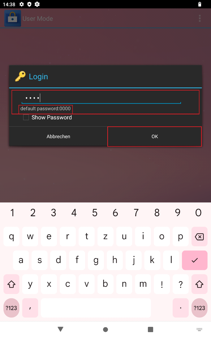 Pressing or clicking on "Admin Mode" opens a login window, which allows you to switch from user mode to admin mode after entering the correct admin password and confirming by pressing or clicking on "OK".