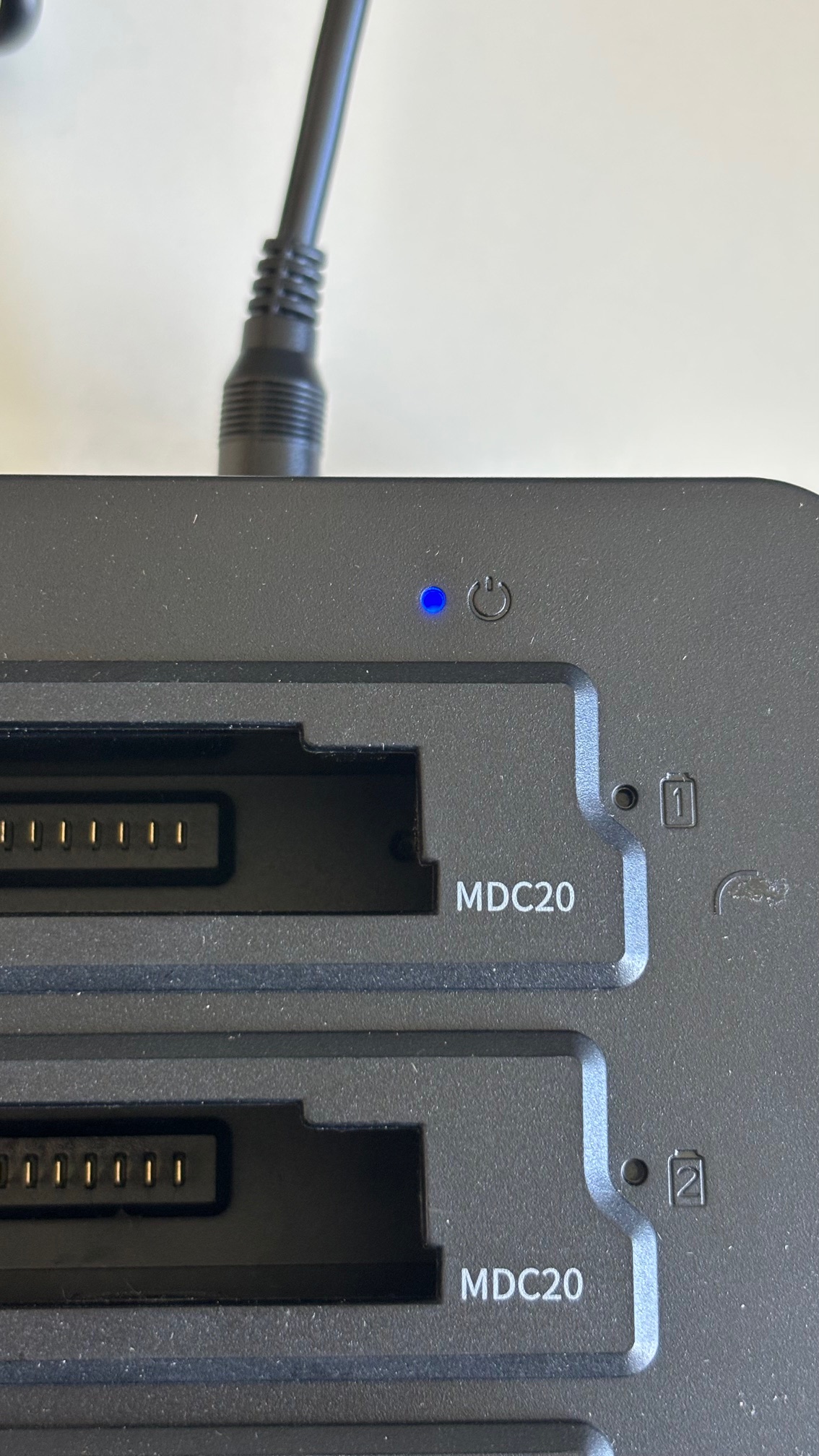 - Stellen Sie sicher, dass die Dockingstation mit Strom versorgt wird. Die Power-LED (Nr. 1 Bei den Bedienungs- und Anzeigeelementen, Ansicht von oben) muss aufleuchten.