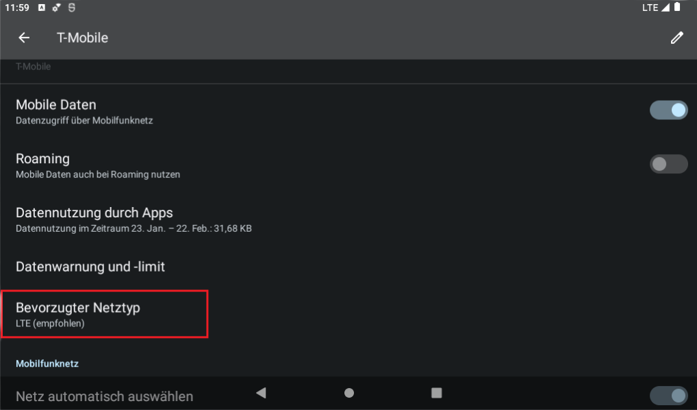 - Um den schnellen Verbindungsstandart LTE zu verwenden. drücken bzw. klicken Sie weiter unten im selben Menü auf „Bevorzugter Netztyp“.