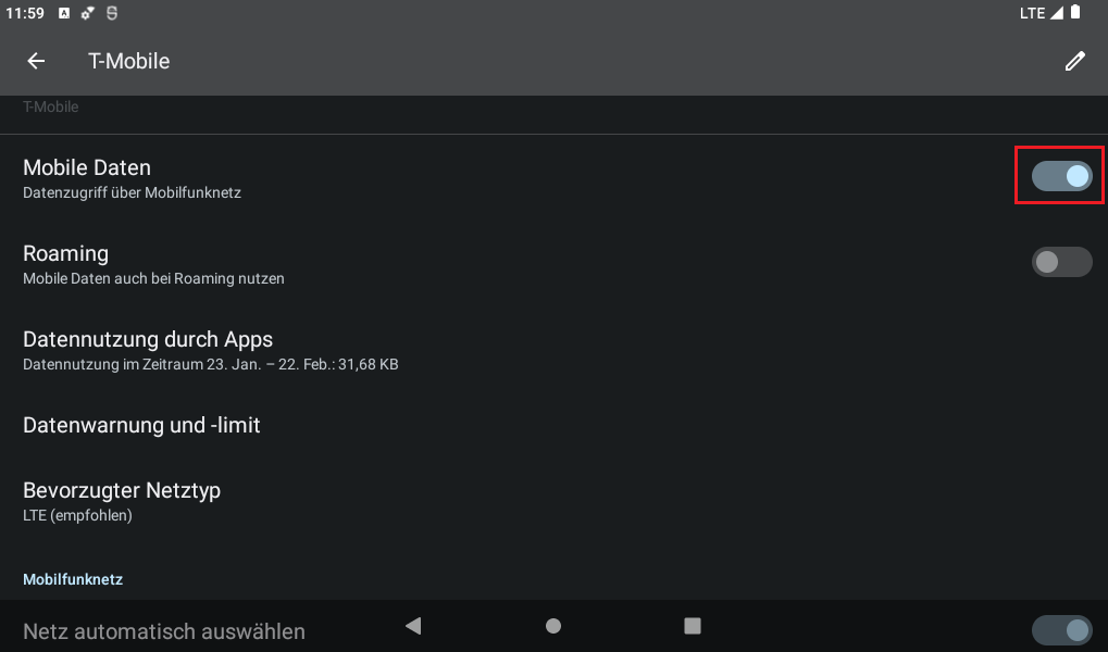 - Aktivieren Sie die Nutzung mobiler Daten, indem Sie den Schalter von links nach rechts schieben.