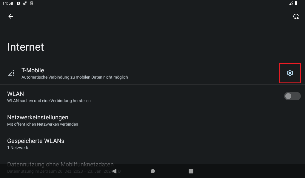 - Klicken oder drücken Sie auf das Zahnradsymbol rechts in der Zeile, in der Ihr Mobilfunkanbieter angezeigt wird.