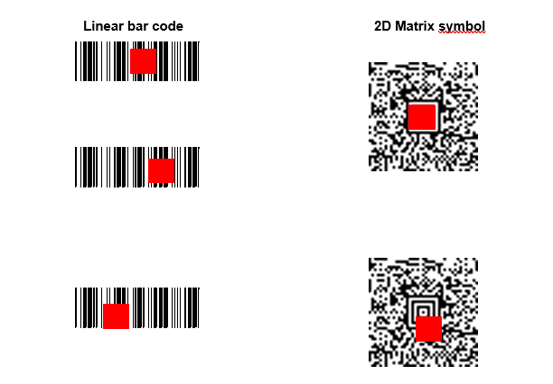 Das Scan-Modul verfügt über einen Sucher, der ein leuchtend rotes Zielfeld projiziert. Der Zielstrahl sollte sich in der Mitte des Strichcodes befinden, er kann aber auch außerhalb der Mitte positioniert werden, um eine gute Lesung zu ermöglichen.