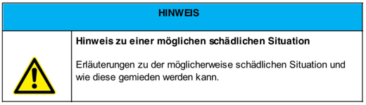 Hinweis zu einer möglichen schädlichen Situation Erläuterungen zu der möglicherweise schädlichen Situation und wie diese gemieden werden kann. |