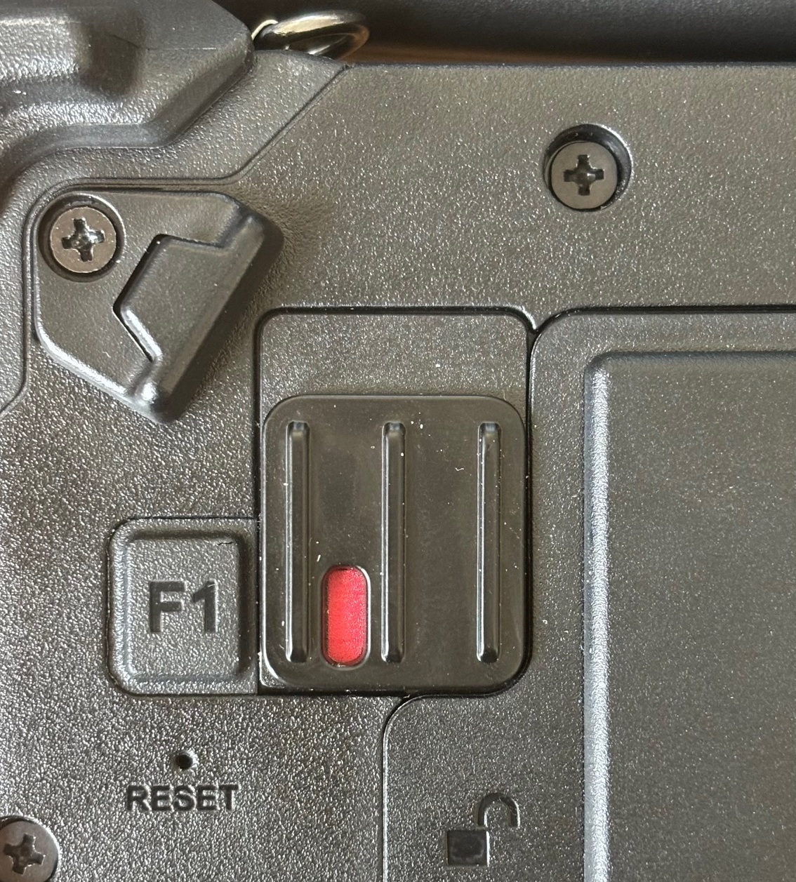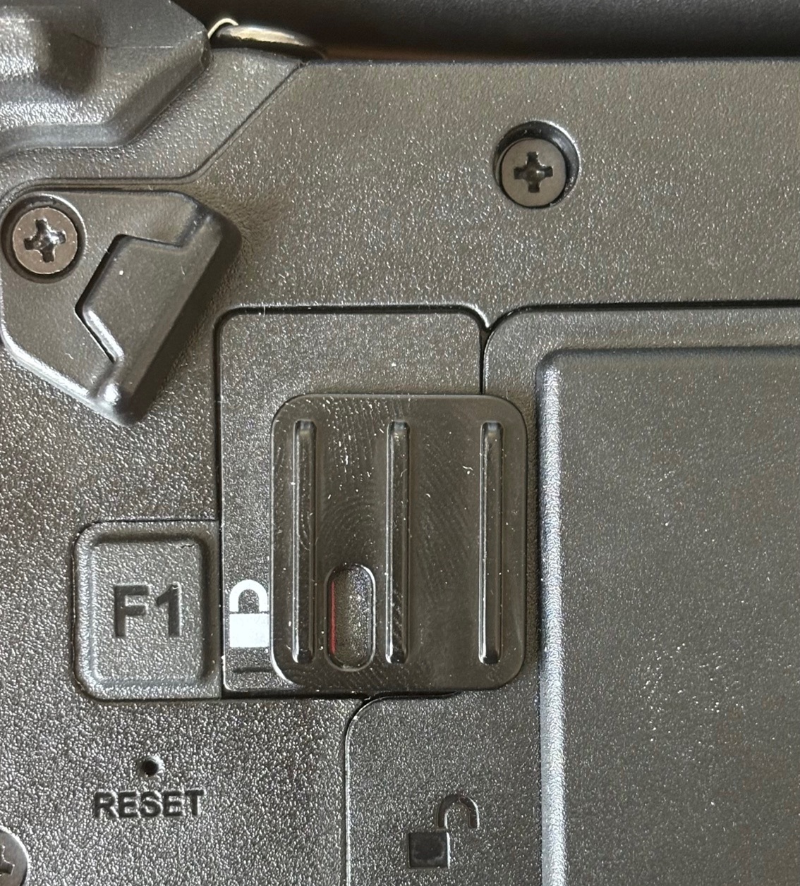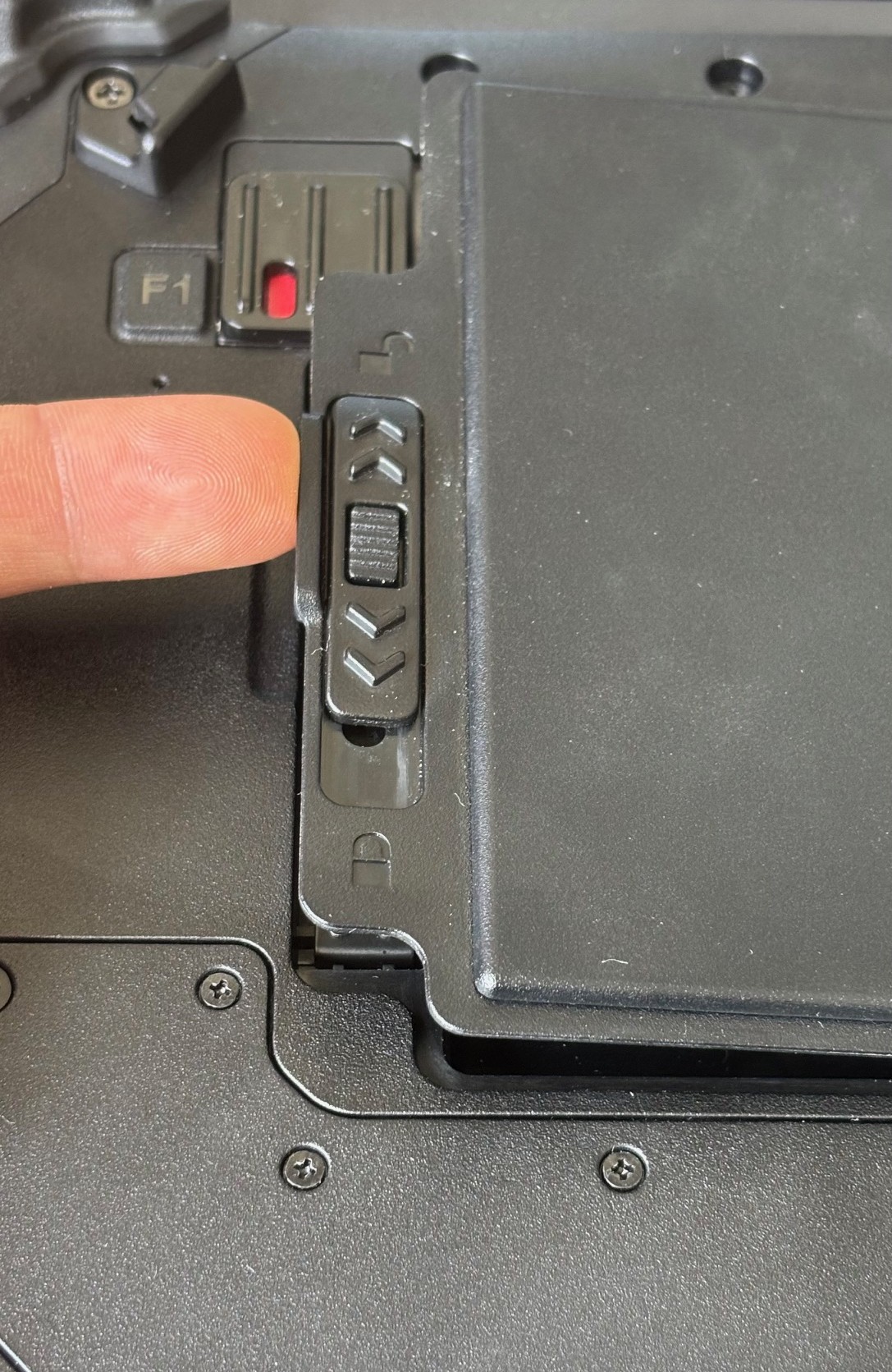 - Entriegeln Sie die Sicherung, indem Sie den Riegel zum Rand des Tablets hin schieben, sodass eine rote Fläche sichtbar wird.