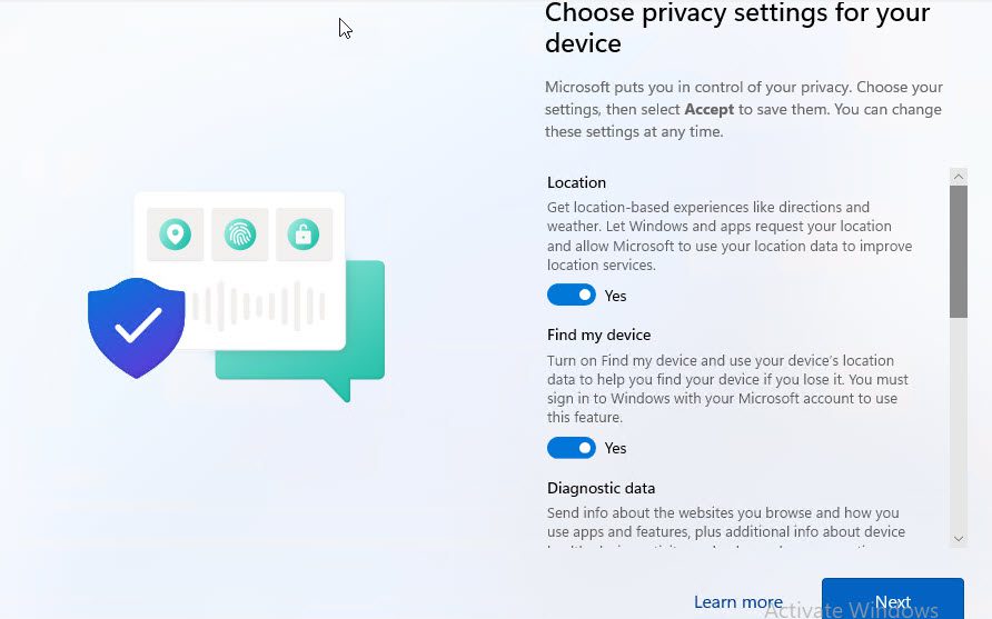 - Then select which authorizations and data you want to grant Microsoft and click Yes or No and Accept in the following windows.