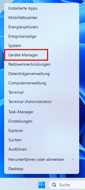 - Öffnen Sie den Geräte-Manager (z.B. über folgende Methode: Rechtsklick/langer Tipp auf das Windows-Logo in der Taskleiste -> "Geräte-Manager" im Kontextmenü anklicken/antippen)