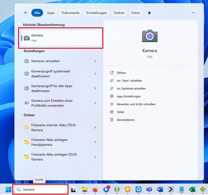 Wie für das Öffnen von Windows-Programmen allgemein, gibt es auch für die Kamera-App mehrere Möglichkeiten, diese zu öffnen. Beispielhafte Methode: