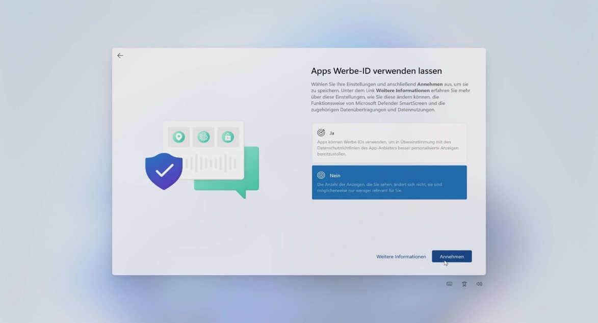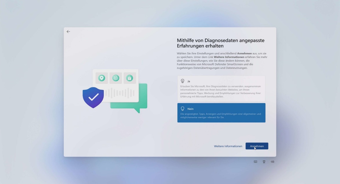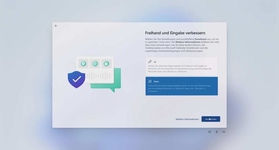 - Wählen Sie im Anschluss noch, welche Berechtigungen und Daten Sie Microsoft gewähren wollen, indem Sie in den folgenden Fenstern wahlweise Ja oder Nein klicken und Annehmen