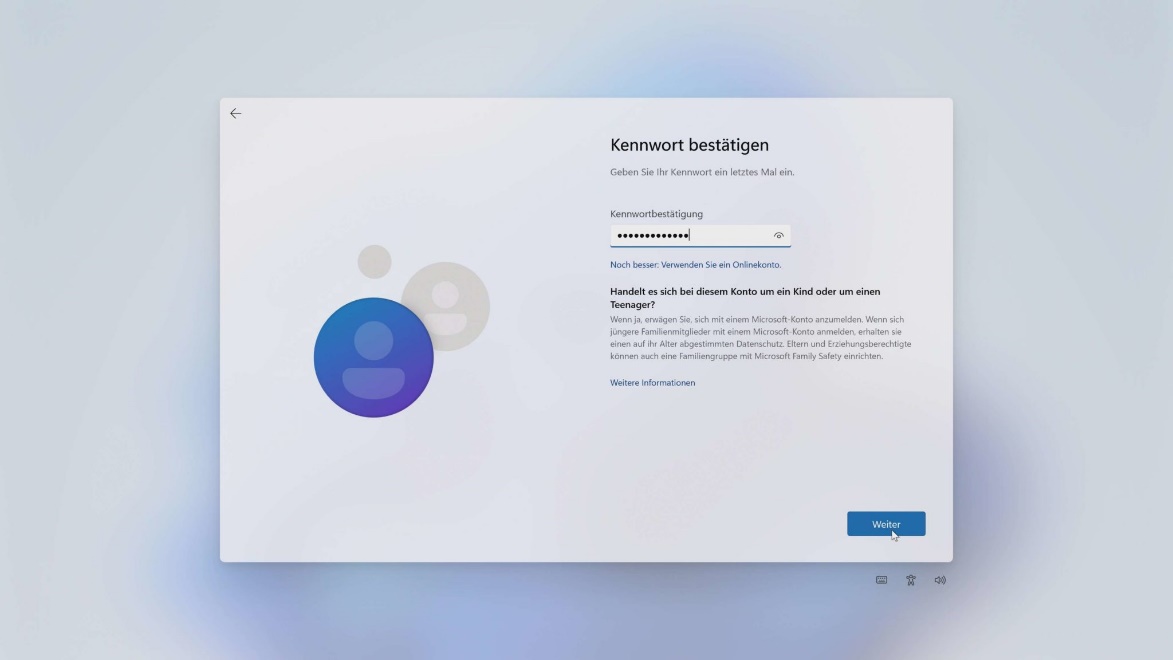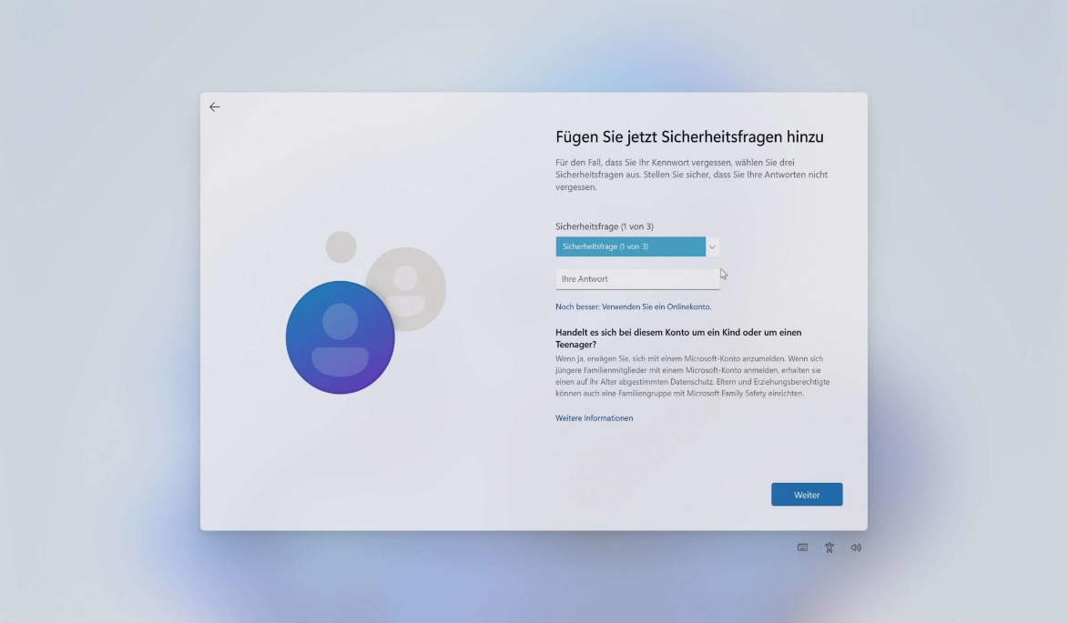 - Um ein lokales Konto zu erstellen legen Sie Benutzername und Kennwort fest und fügen sie eine Sicherheitsfrage hinzu.